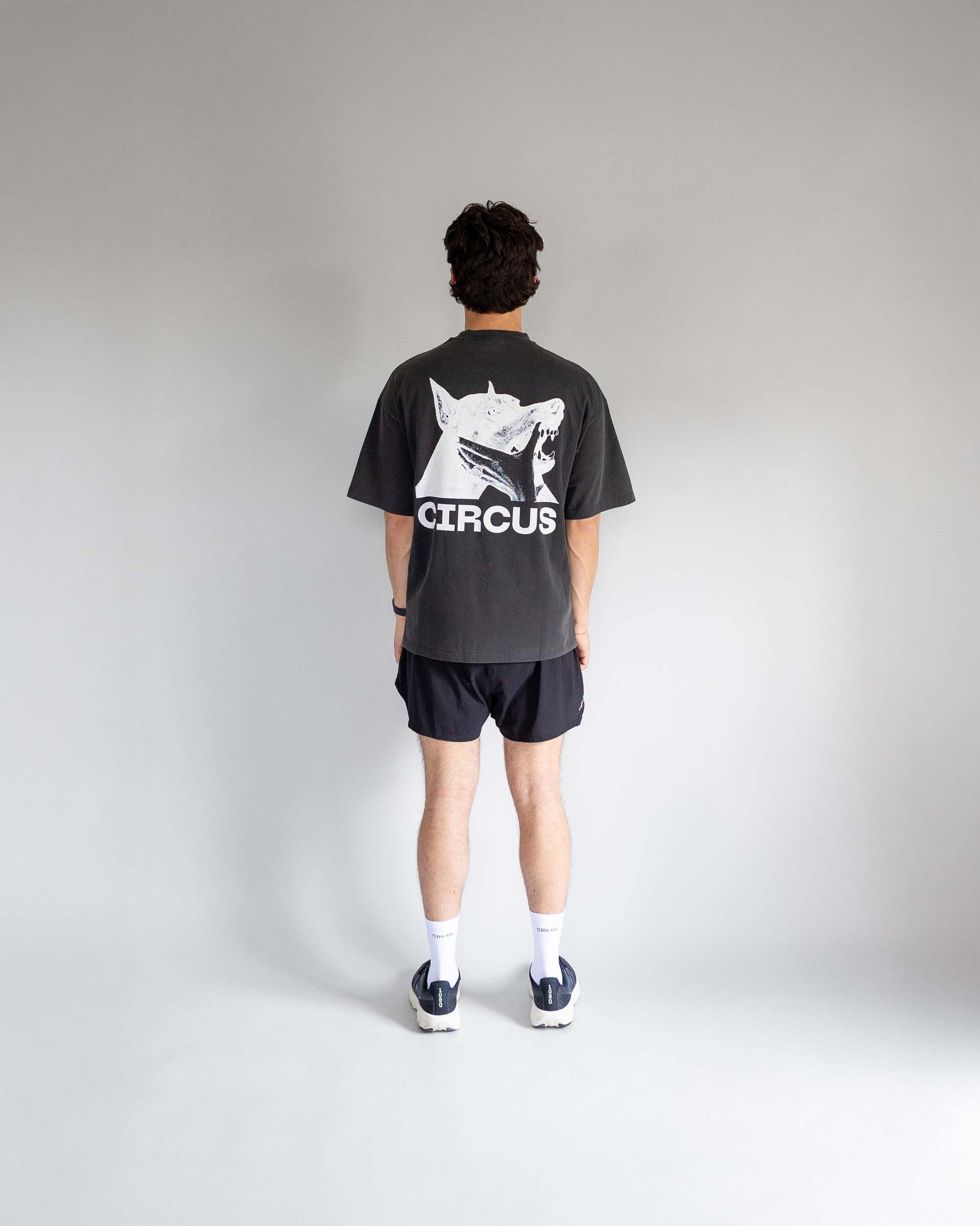 CIRCUS™ Doberman t-shirt is constructed from 240gsm 100% organic cotton jersey. Cut in an oversized silhouette. The Doberman symbolises the balance required for ultra distance - the will to fight vs the delicacy required to hold back from over exertion.